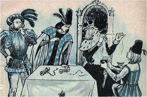 However, both set to work eagerly, for each wanted to be a queen. The youngest son had no maiden whom he loved. He was too quiet and shy to mix at Court. Sadly, he put the flax away in his pocket and rode out into the forest. Now, a few years before this, in a nearby kingdom, a young princess had been unlucky enough to displease a wicked witch and the witch had turned her into a mouse. "A mouse you shall stay, until the day you make me laugh," the witch had cackled. Since the witch was very bad tempered and had never been known to laugh in her life, there seemed very little chance for the princess ever to return to her natural form, so she had run away. On the day that the youngest prince rode by, the mouse princess was sitting on top of a ruined wall and it just so happened that here the young prince stopped to rest for a while. Seeing that he looked sad, the mouse ran down to join him. "What is the matter?" she asked. The prince told her the whole story and when he had finished, she said, "Do not worry. Leave the flax with me. When you return in seven days, you will see what you shall see." A week later, the prince returned and the mouse was waiting for him with a little box. The puzzled young prince thanked the mouse and returned to the Court. His brothers were already there, showing their father the thread woven by their ladies. The countess's thread was a thick and as coarse as rope, while that spun by the duke's daughter was thin and straggly. Then, the youngest prince offered the box to his father and when the king opened it, he found a ball of bright, shiny thread, as fine as hair, but so strong that he could not break it. The king smiled and said, "Now, I have seen what your ladies can do. Tomorrow, I would like to see the ladies themselves. Bring them here at midday and then I will tell you which of you is to become king in my place."